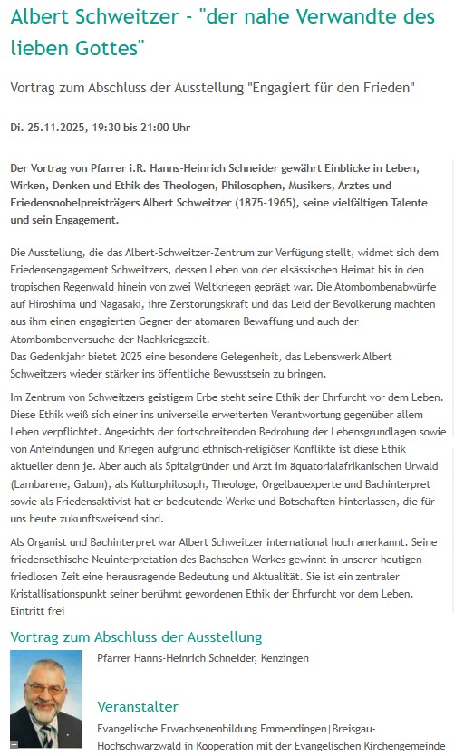 Beachten Sie bitte auch die Informationen über die Ausstellung/Veranstaltungen zu Albert Schweitzer im November (siehe unten unter Veranstaltungen aktuell).
