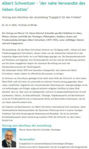 Albert Schweitzer – „der nahe Verwandte des lieben Gottes“ – Vortrag zum Abschluß der Ausstellung “ Engagiert für den Frieden“ Beitragsautor Von Andreas Jahn Beitragsdatum November 5, 2025 Keine Kommentare zu Albert Schweitzer – „der nahe Verwandte des lieben Gottes“ – Vortrag zum Abschluß der Ausstellung “ Engagiert für den Frieden“ Kalender Wann: November 25, 2025 um 7:30 pm – 9:00 pm 2025-11-25T19:30:00+01:00 2025-11-25T21:00:00+01:00 Wo: Evanhgelisches Gemeindehaus Bad Krozingen Schwarzwaldstraße 7 Bildung ← Abendserenade des Bläserkreises Bad Krozingen-Hartheim Schreibe einen Kommentar Antworten abbrechenDeine E-Mail-Adresse wird nicht veröffentlicht. Erforderliche Felder sind mit * markiertKommentar * Name * E-Mail * Website Meinen Namen, meine E-Mail-Adresse und meine Website in diesem Browser für die nächste Kommentierung speichern.