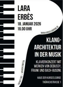 Klavierkonzert mit Lara Erbes – Bitte beachten_Anfangszeit: 16:00! Beitragsautor Von Andreas Jahn Veröffentlichungsdatum Dezember 23, 2025 Keine Kommentare zu Klavierkonzert mit Lara Erbes – Bitte beachten_Anfangszeit: 16:00! Kalender Wann: Januar 18, 2026 um 4:00 p.m. 2026-01-18T16:00:00+01:00 2026-01-18T16:15:00+01:00 Wo: Haus der Kurseelsorge, Bad Krozingen, gegenüber Vita Classica Thürachstrasse 1 Musik ← Christvesper mit Weihnachstmusical → Weihnachtsoratorium getanzt Bitte um Anmeldung! Schreibe einen Kommentar Antwort abbrechenDeine E-Mail-Adresse wird nicht veröffentlicht. Erforderliche Felder sind mit * markiertKommentar * Name * E-Mail-Adresse * Website Meinen Namen, meine E-Mail-Adresse und meine Website in diesem Browser für die nächste Kommentierung speichern.