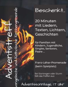 Ökumenischer Adventstreff im Wohngebiet Kurgarten Beitragsautor Von Andreas Jahn Beitragsdatum November 19, 2025 Keine Kommentare zu Ökumenischer Adventstreff im Wohngebiet Kurgarten Kalender Wann: November 30, 2025 um 10:17 am Repeats 2025-11-30T10:17:00+01:00 2025-11-30T10:32:00+01:00 Wo: Wohngebiet Kurgarten Franz Lehar Promenade (beim Spielplatz) Familien Gemeinschaft ← Albert Schweitzer – „der nahe Verwandte des lieben Gottes“ – Vortrag zum Abschluß der Ausstellung “ Engagiert für den Frieden“ → Krabbelgruppe im Gemeindesaal Schreibe einen Kommentar Antworten abbrechenDeine E-Mail-Adresse wird nicht veröffentlicht. Erforderliche Felder sind mit * markiertKommentar * Name * E-Mail * Website Meinen Namen, meine E-Mail-Adresse und meine Website in diesem Browser für die nächste Kommentierung speichern.