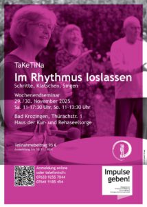 TakeTiNa – Im Rhythmus Loslassen – Wochenendseminar Beitragsautor Von Andreas Jahn Beitragsdatum August 22, 2025 Keine Kommentare zu TakeTiNa – Im Rhythmus Loslassen – Wochenendseminar Kalender Wann: November 29, 2025 um 11:00 am – November 30, 2025 um 1:30 pm 2025-11-29T11:00:00+01:00 2025-11-30T13:30:00+01:00 Wo: Haus der Kurseelsorge Thüracherstr 1 Bad Krozingen Bildung Erwachsene Gemeinschaft ← Harfenklänge und Gedichte mit Dr Sabine Halbe (Gedichte( und Sabine Wehrle (Harfe) → Aktionstag Zusammen sind wir Heimat Schreibe einen Kommentar Antworten abbrechenDeine E-Mail-Adresse wird nicht veröffentlicht. Erforderliche Felder sind mit * markiertKommentar * Name * E-Mail * Website Meinen Namen, meine E-Mail-Adresse und meine Website in diesem Browser für die nächste Kommentierung speichern.