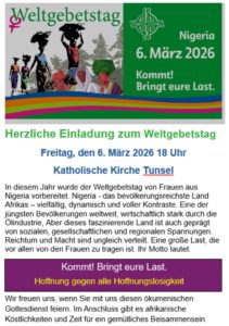 Wir laden herzlich ein am 6. März um 18.00 Uhr zum Ökumensichen Gottesdienst in die Katholische Kirche in Tunsel. Jedes Jahr am ersten Freitag im März ist Weltgebetstag der Frauen. Für dieses Jahr wurde die Ordnung des Gottesdienstes von Frauen aus Nigeria geschrieben. Das Motto: „Kommt, bringt eure Last.“