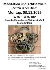 Die Vernissage zur Ausstellung findet am 2. November gegen 19.00 Uhr im Anschluss an die Abendandacht mit Musik und Poesie in der Reihe (ÜBER)LERBENSKUNST statt – mit Doris Banzhaf von der Evangelischen Erwachsenenbildung. Herzliche Einladung!